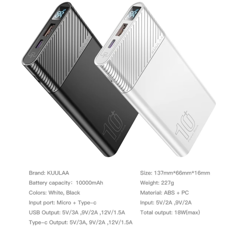 KUULAA Power Bank 10000mAh: QC PD, 3 USB, White